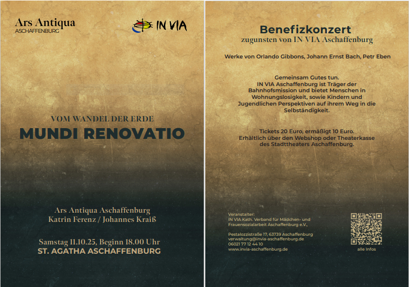 Zugunsten IN VIA Aschaffenburg präsentiert sich Ars Antiqua mit drei Chören, dem Kinderchor, dem Jugendchor "die junge ars" und dem Kammerchor. Als einzelne Ensembles wie auch gemeinsam gestalten sie ein facettenreiches Programm zum Thema "Erde".